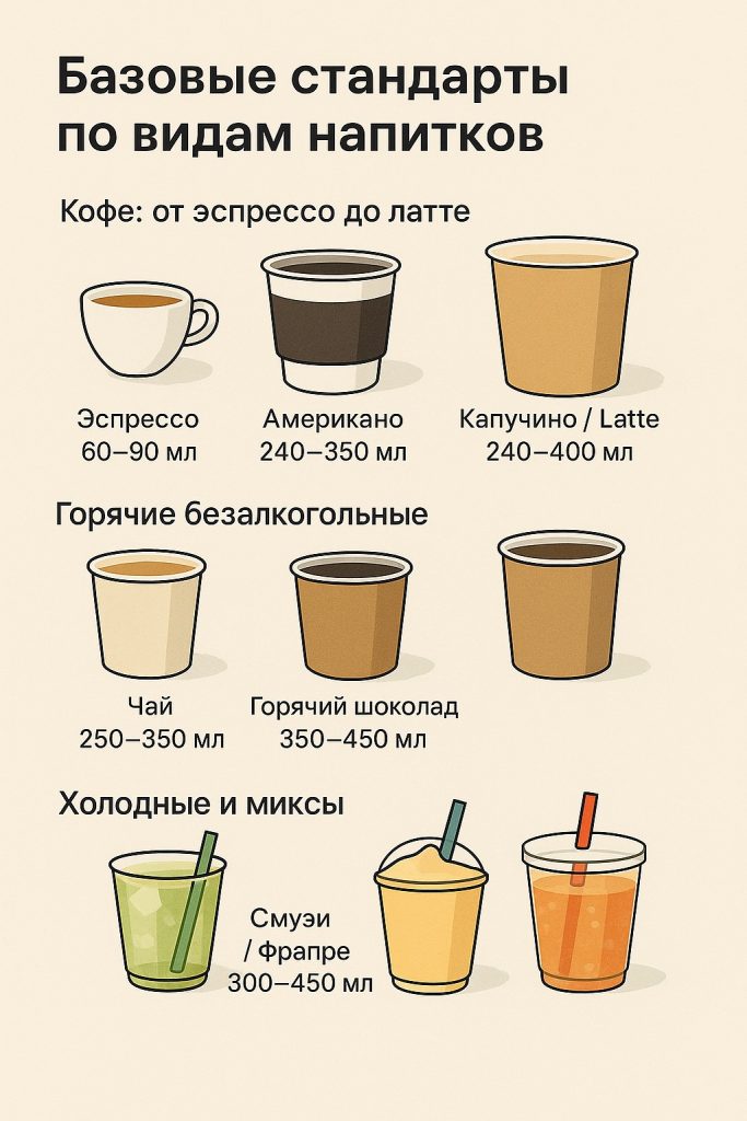 Правильный выбор объёма — это вкусовой баланс напитка, удобство гостя и управляемая себестоимость. Разные рецептуры требуют своих размеров: эспрессо не подают в «смузи-формате», а латте не поместится в мини-чашке.